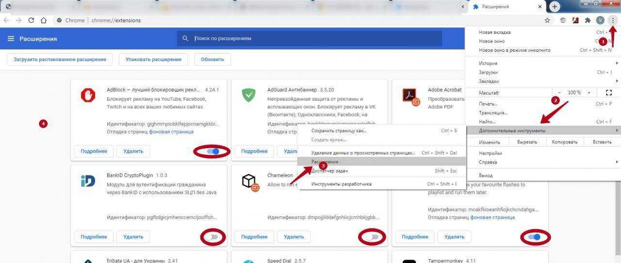 Попробуйте запустить браузер, предварительно отключив все расширения. Делается это в главном меню приложения. Вызовите его, выберите «Дополнительные инструменты», а в выпадающем меню кликните «Расширения». Отключите каждое их них вручную — щелкайте по ползункам справа внизу, чтобы те становились серыми. После решения проблемы, или когда убедитесь, что дополнения невиновны, аналогично задействуйте их.