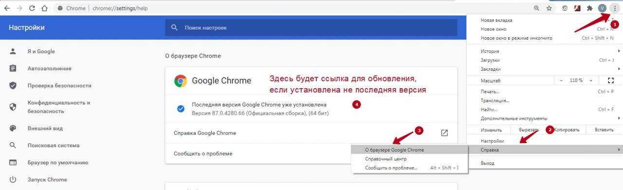 Устаревшая версия Хрома не умеет работать с новыми технологиями, которые развиваются ежедневно. Обновите приложение. Для этого откройте главное меню (кликните по кнопке с тремя точками справа вверху) и нажмите «Обновить Google Chrome», после скачивания файлов – «Перезапустить». Если этих кнопок нет или в окне информация об ошибке, то загрузите онлайн-установщик с официального сайта и запустите его. Старую версию предварительно можете удалить (необязательно).