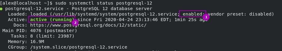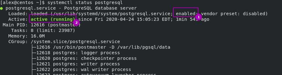 Обязательно проверяем, что после установки служба postgresql активна и включена на запуск при загрузке:
