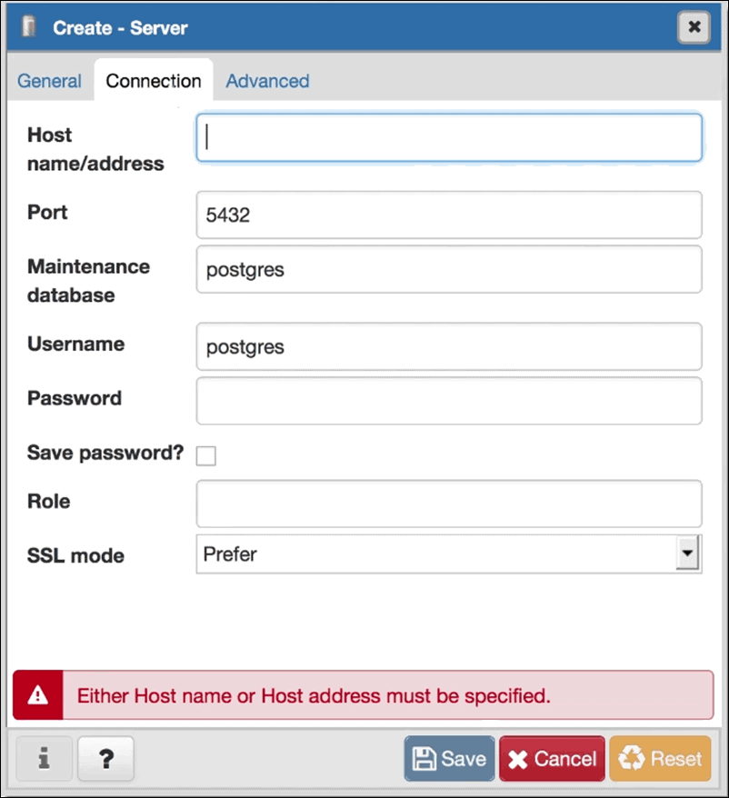 The Hostname/address is the location of the machine where the PostgreSQL server is running. A connection with your user account is established once you save the information entered. The interface presents an overview of the databases that your user account has access to.