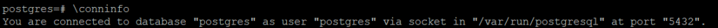 Чтобы посмотреть информацию о подключении, выполним в psql команду: