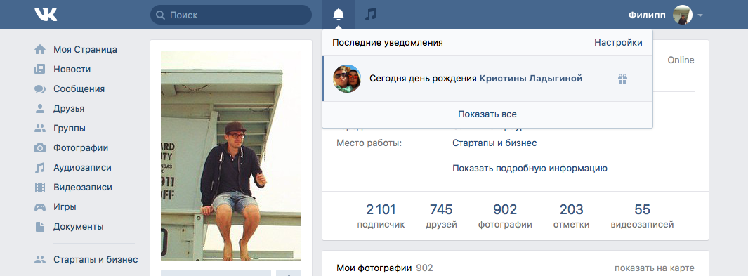 В центр уведомлений приходят сообщения о новых отметках «Мне нравится», заявках на добавление в друзья, упоминаниях, днях рождения и прочем. Кроме того, на страницах людей и сообществ теперь можно подписаться на уведомления о новых записях.