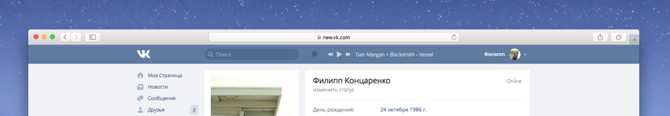 Полностью переработана шапка сайта — она растянута на всю ширину страницы. Исчезли прежние элементы меню («Люди», «Сообщества», «Игры», «Помощь»). Теперь здесь расположены центр уведомлений, быстрый доступ к разделу «Музыка» и меню профиля.