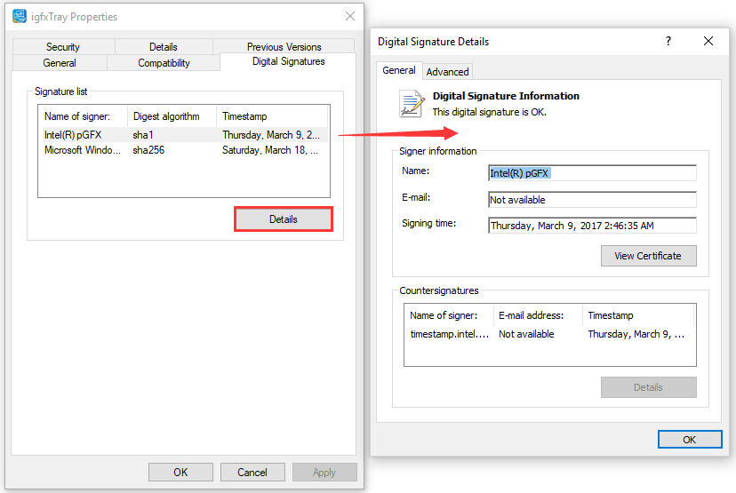 Step 3: Switch to the Digital Signatures tab. All signatures will be presented in the Signature list. Highlight one from the list and then hit the Details button to see details of the signature.