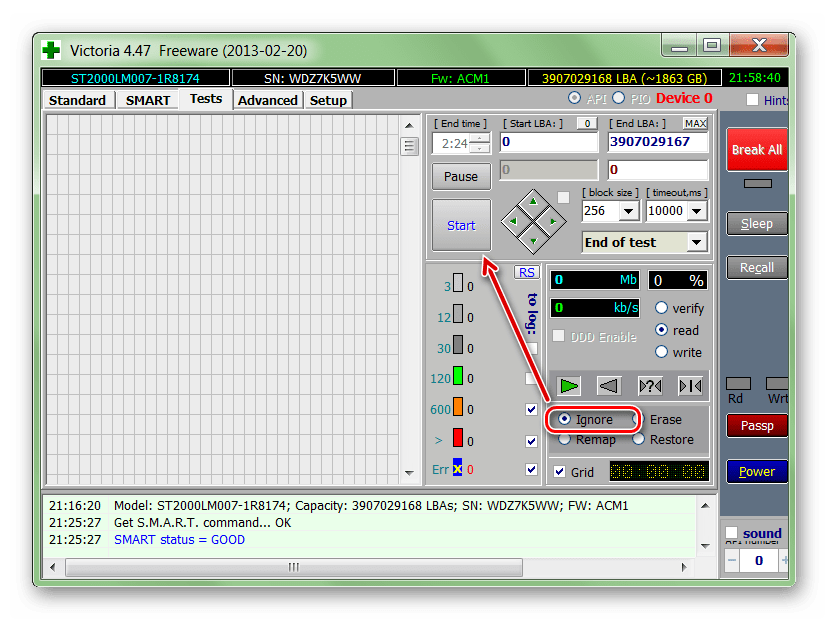 - Режим Ignore – программа Victoria HDD выполнит проверочное сканирование и не будет предпринимать никаких действий по восстановлению секторов жесткого диска.