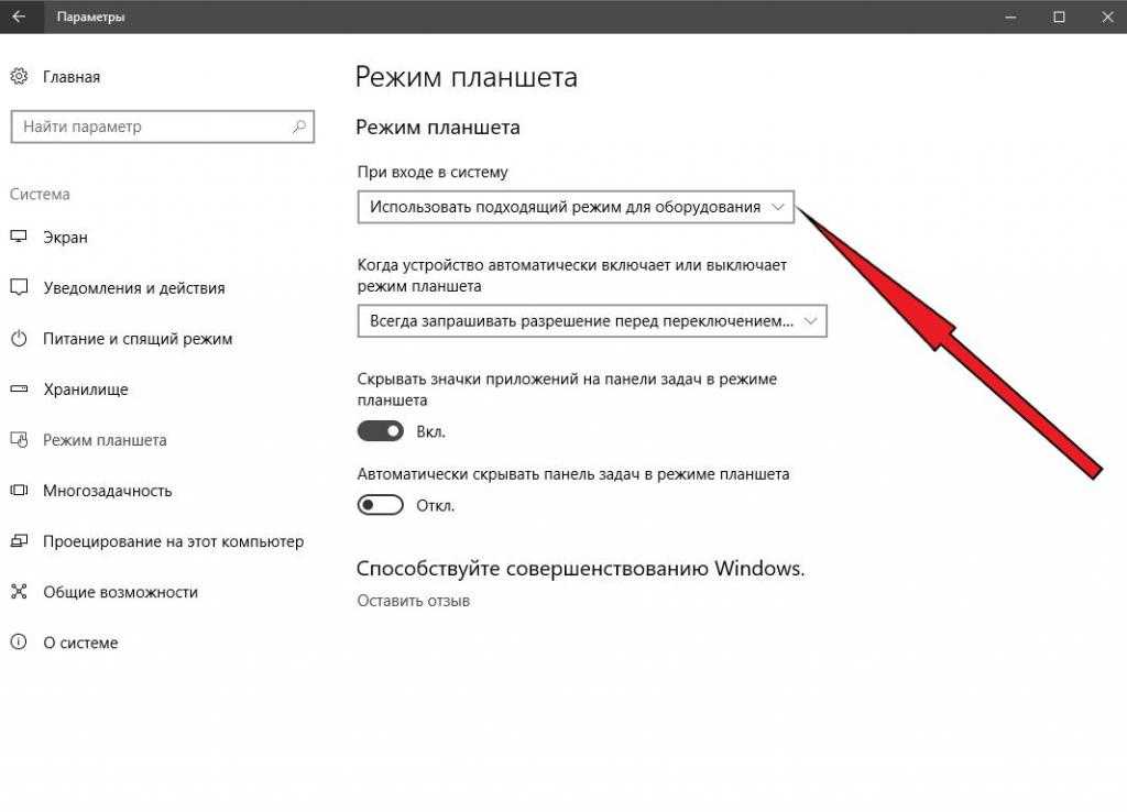Нажатие на эти кнопки откроет меню со списком. Первым в нем будет нужный режим. Если строчка яркая, значит режим включен. Выделением левой клавиши мыши ее нужно деактивировать. Надпись должна потускнеть. После этих действий следует поочередно пройти путь: «Пуск» — «Настройки» (знак шестеренки) — «Параметры Windows» — «Система» — «Режим планшета» — «Использовать режим рабочего стола» — «Всегда запрашивать разрешение перед переключением режима».