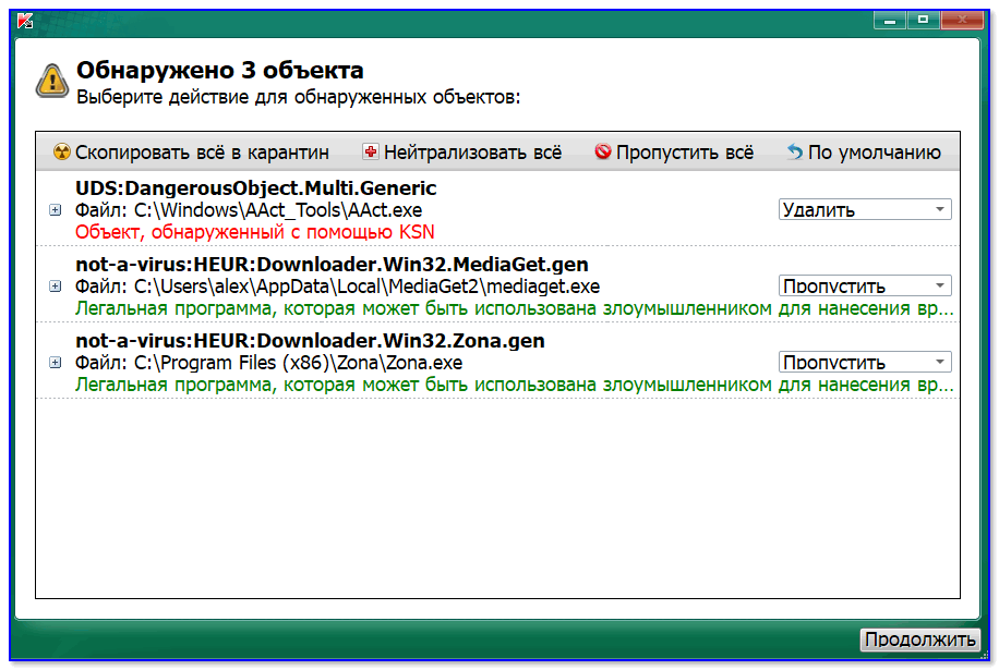 Касперский ко всем найденным угрозам автоматически дает примечания и ставит рекомендательные действия: «Удалить», «Пропустить» и т.д. Вам останется только подкорректировать их (в случае необходимости) и нажать кнопку «Продолжить» .