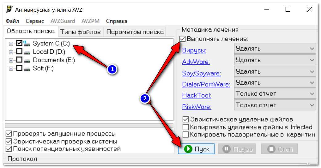 Для начала сканирования ОС: запустите AVZ, выберите системный диск, и нажмите кнопку «Пуск» . См. мой пример на скриншоте ниже.