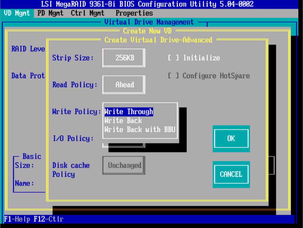 Политика Write-Through: Включая данную политику контроллер начинает посылает сигнал о завершении записи только тогда, когда информация упадет на физические носители, т.е. 100 процентов будет уже на жестких дисках. Обеспечивает более высокую безопасность. Данный режим не использует кэш для ускорения записи, и будет медленнее других, однако позволяет так же достичь хороших показателей при RAID 0 и RAID 10.