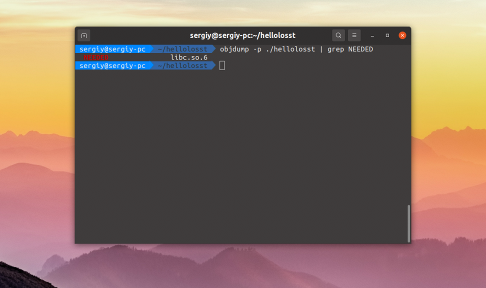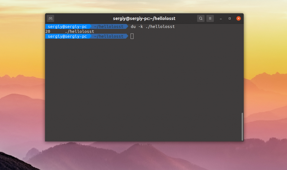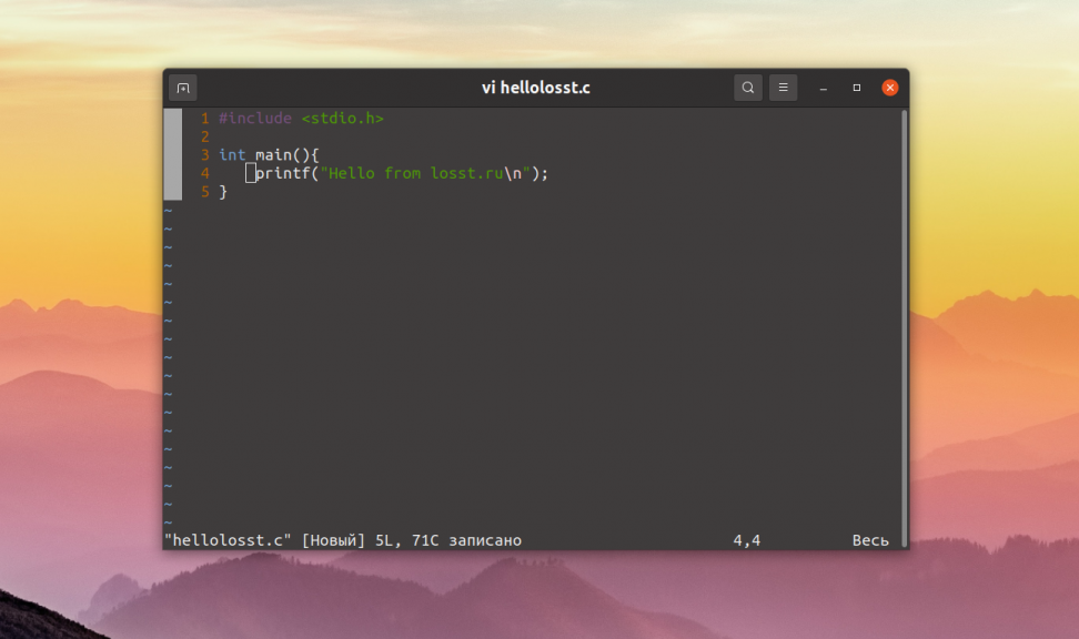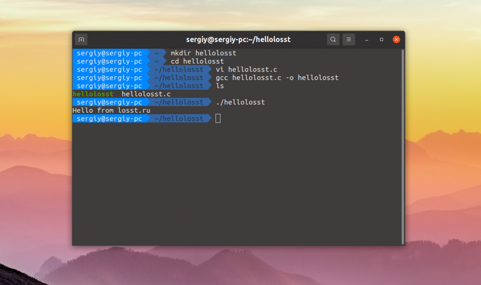 Давайте создадим для этого примера небольшую программу на Си. Она будет называться hellolosst и будет выводить на экран строку Hello from losst.pro в терминал при запуске. Сначала создайте папку hellolosst и перейдите в неё: