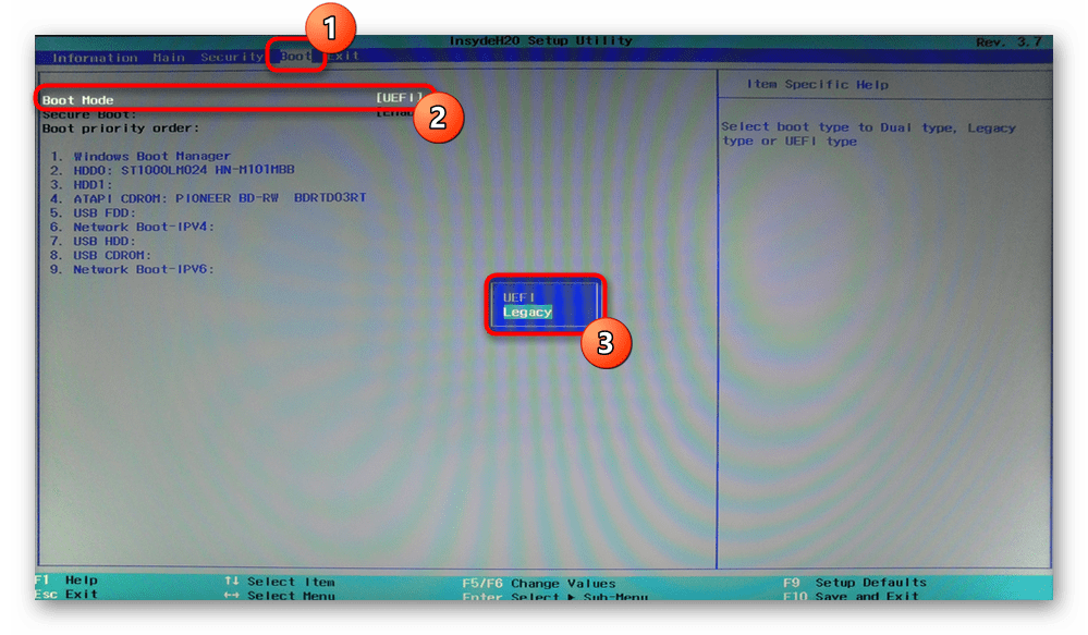Каждый компьютер с операционной системой Windows 8 или выше, имеет UEFI с функцией Legacy Boot, которая загружает BIOS из чипа CMOS. Зайдите обратно в BIOS. Далее вам нужно найти строку UEFI/BIOS Boot Mode и изменить на Legacy Boot, если был включен UEFI, и наоборот, если был включен UEFI, то на Legacy Boot. Нажмите F10, чтобы сохранить изменения. Если это не помогло решить ошибку “Reboot and select proper Boot Device or Insert Boot Media in selected Boot device“, то верните значение как было.