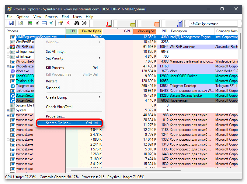 Допустим, через «Диспетчер задач» не удалось найти подозрительный процесс и отследить его активность. В таком случае снова поможет Process Explorer, о взаимодействии с которым уже было сказано выше. Если вы обнаружили подозрительные задачи, которые нагружают процессор или видеокарту, можно оперативно перейти к их поиску через интернет. Для этого в самом мониторе щелкните по процессу правой кнопкой мыши и из контекстного меню выберите пункт «Search Online».