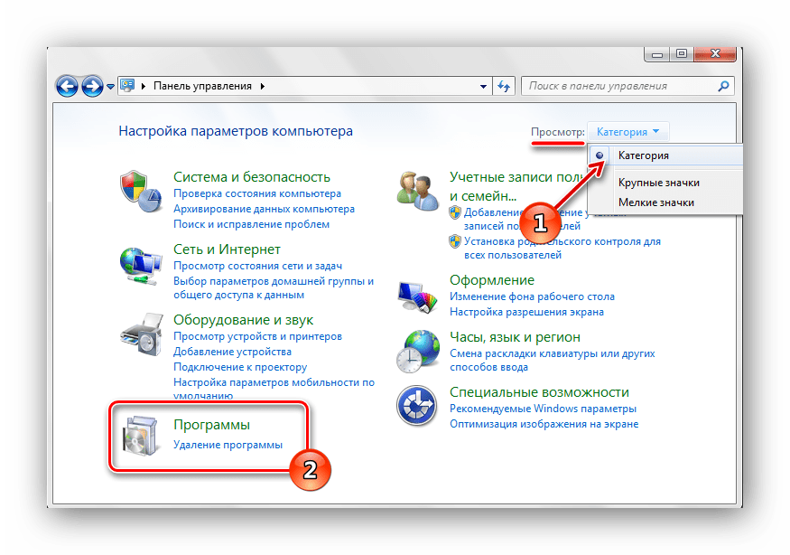 В открывшейся консоли совершаем переход в «Программы» (предварительно установив в меню «Просмотр» параметр «Категория»).