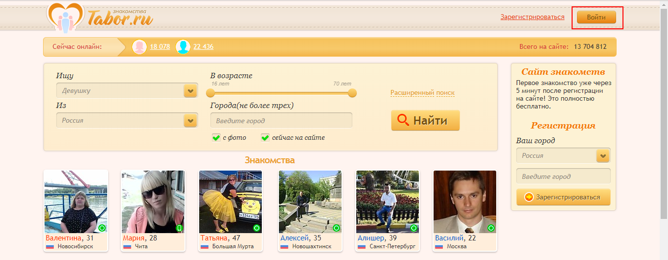 Если Вы забыли пароль, то нажмите кнопку «Восстановление доступа» на странице со входом.Бесплатный сайт знакомств Табор.ру доступен на русском языке в режиме онлайн 24 часа в сутки. Более 6 миллионов девушек и 7 миллионов мужчин зарегистрированы для серьёзных отношений в этой социальной сети.