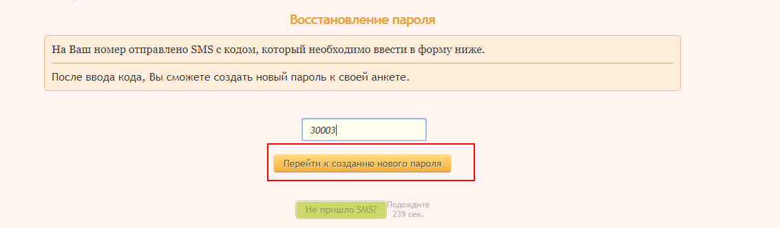 - На указанный номер телефона придет СМС-сообщение с кодом – введите этот код в соответствующее поле и нажмите на кнопку Перейти к созданию нового пароля;