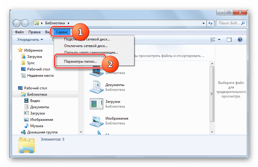 - Откройте Проводник Виндовс. Расположившись в любой директории, кликните по пункту «Сервис». Затем выберите «Параметры папок…».