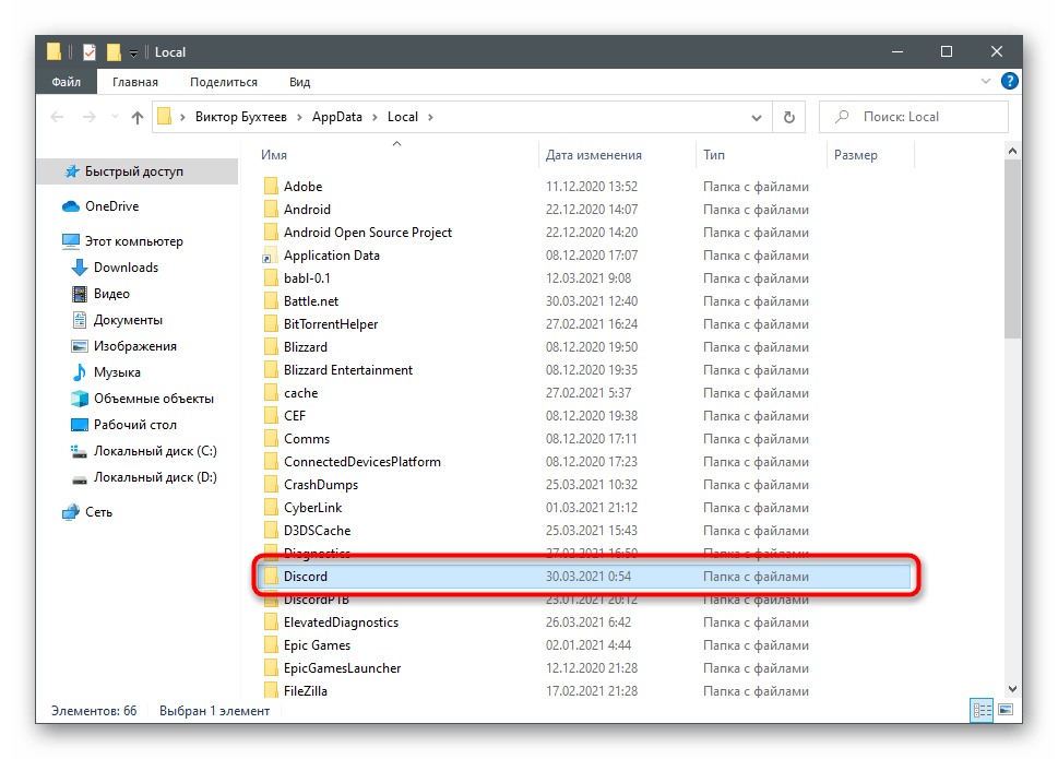 Найдите в появившемся окне папку «Discord» и щелкните по ней правой кнопкой мыши.