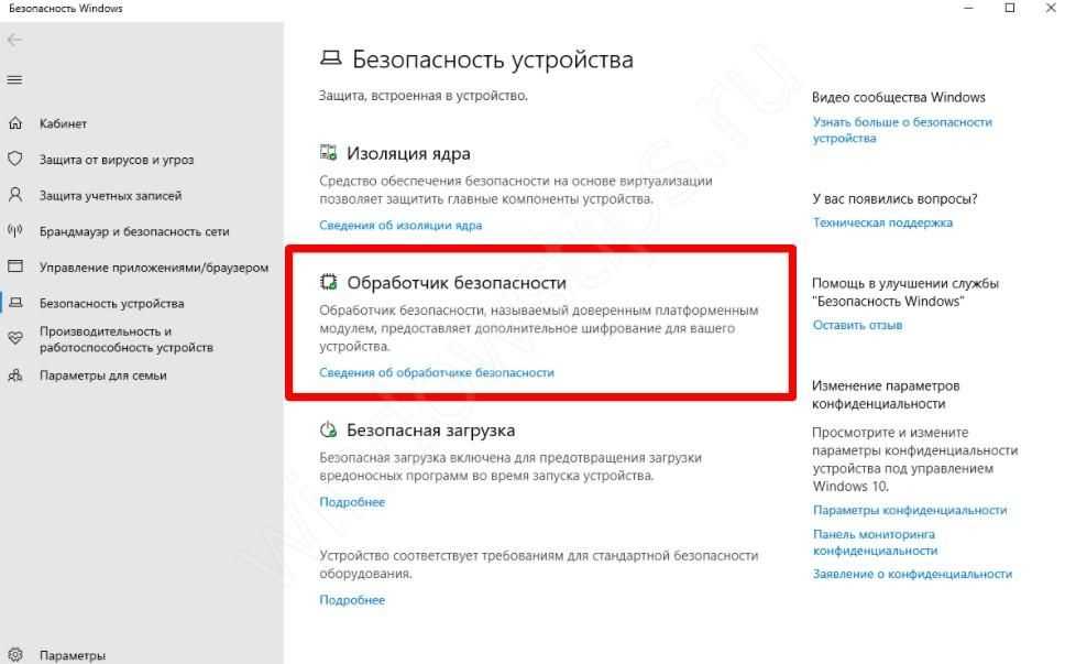 - Найдите в нем раздел «Устройства безопасности». Если этого пункта нет, значит и ТРМ для Windows 11 также отсутствует.