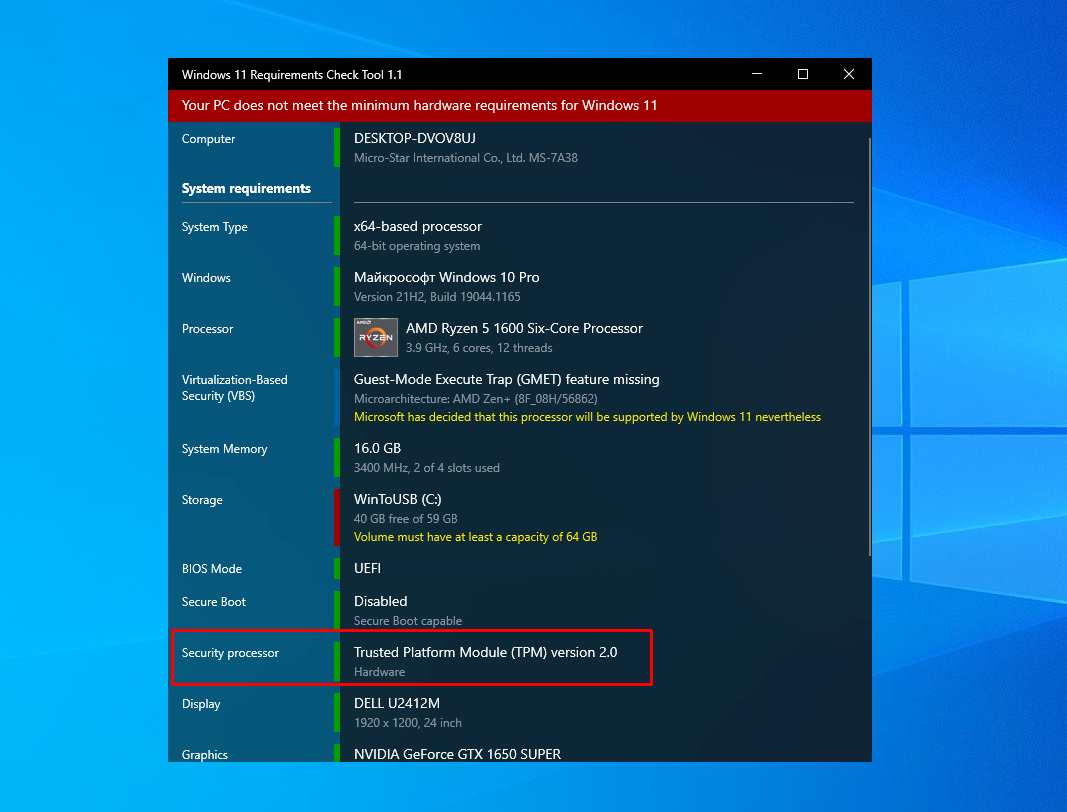 TPM 2.0 – одно из основных требований для работы ОС Windows 11. Ваш процессор, память и видеокарта также должны соответствовать требованиям. Зайдите на сайт Windows 11, чтобы получить подробную информацию об ОС или проверьте совместимость вашего ПК с ОС Windows 11 с помощью утилиты PC Health Check (временно недоступна для скачивания).