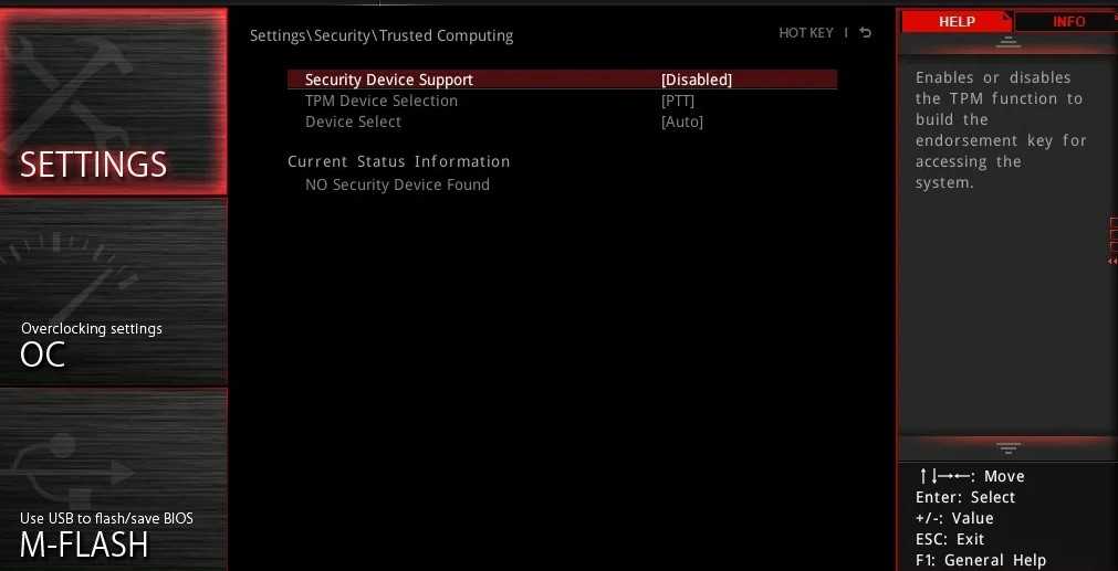 - Перейти «Setting» > «Security» > «Trusted Computing» > «Security Device Support MSI BIOS«.