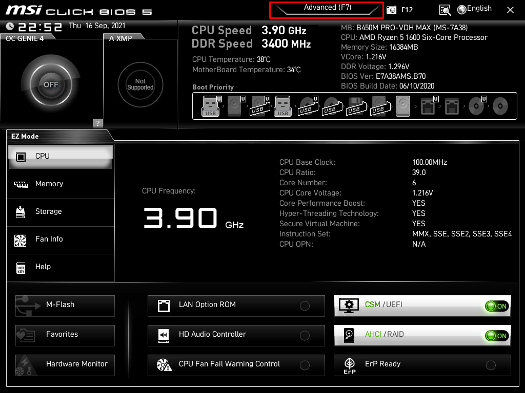 Для того, чтобы зайти в BIOS/UEFI зажмите клавишу Del при включении компьютера. Чтобы получить доступ к настройке переключитесь в Advanced режим (клавиша F7 или кнопка в верхней части экрана).