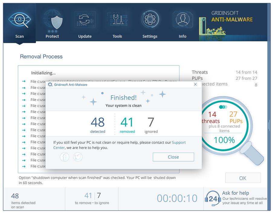Trojan:Win64/ThemidaPacked malware is extremely difficult to eliminate manually. It places its files in several locations throughout the disk, and can restore itself from one of the parts. In addition, various modifications in the windows registry, networking configurations and also Group Policies are really hard to identify and revert to the initial. It is far better to use a special app – exactly, an anti-malware app. GridinSoft Anti-Malware will definitely fit the best for virus elimination reasons.
