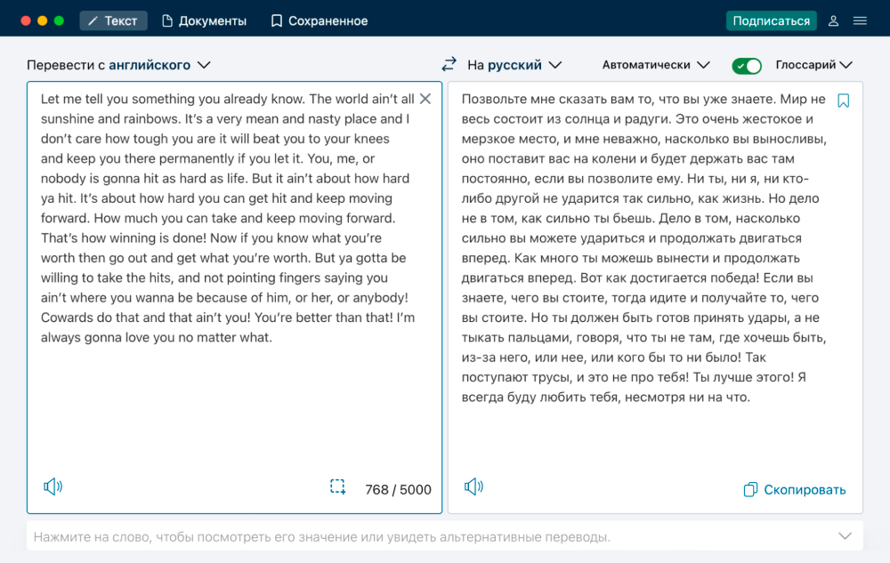 Поддерживается 25 языков, и стандартные связки вроде английский — русский или испанский — русский работают хорошо. За раз можно перевести до пяти тысяч символов, также доступна загрузка документов — до трех в месяц в бесплатной версии. Есть функция глоссария: можно заранее «объяснить» сервису, как правильно переводить нетипичные слова, термины и фразы.