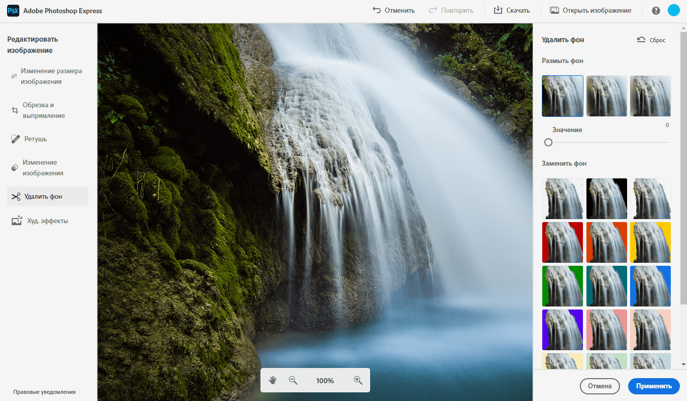 Photoshop Express – это облегченная онлайн-версия Photoshop с базовыми функциями для редактирования фото. В него недавно добавили возможность фонового размытия, которая может удалить фон на любом изображении с объектами на переднем плане. При этом конечное фото сохраняет своё изначальное разрешение, что очень круто.