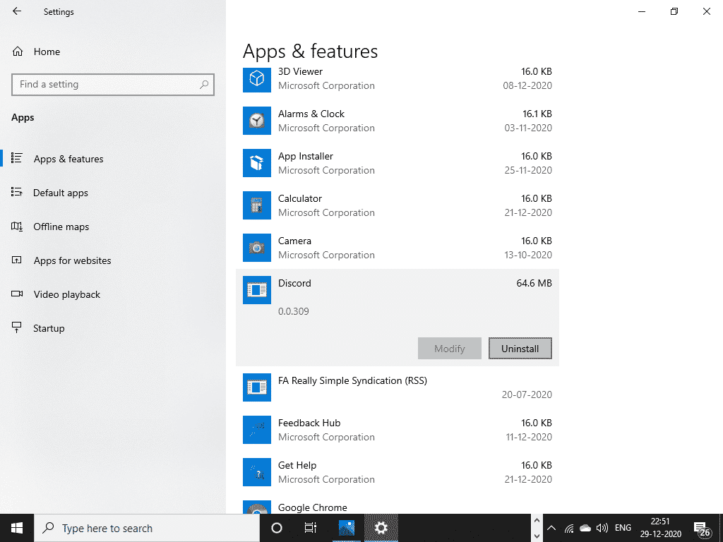 - In the window screen that appears right-click on the Discord app and then choose Delete.