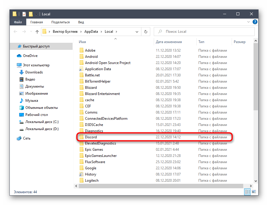 - Выберите папку «Discord» и перенесите ее в любой другой каталог (лучше создать пустой) в этом же расположении или в понравившемся на локальном хранилище.