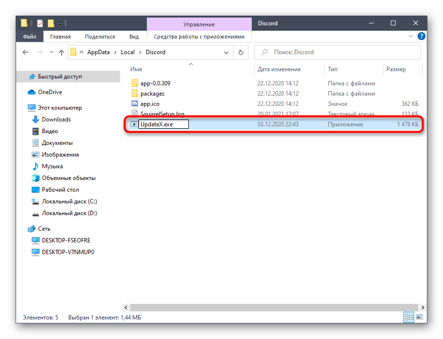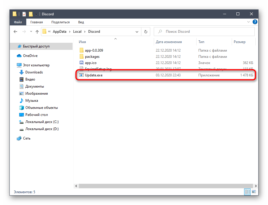 Алгоритмы Discord работают таким образом, что иногда исправить неполадку с установкой апдейтов позволяет переименование файла, который отвечает за эту операцию, однако действовать нужно исключительно в соответствии со следующей инструкцией. Она подразумевает добавление всего одной буквы в этот EXE-элемент, который находится в корне папки с программой.
