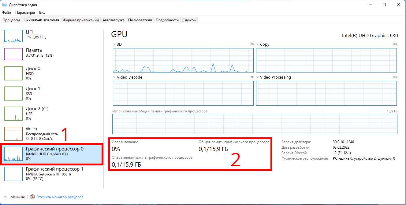 В Диспетчере задач перейдите на вкладку «Производительность». В левой колонки вы увидите Графические процессоры — их может быть несколько.