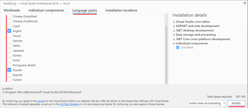 Открыть вкладку Language packs и выбрать нужный языковый пакет, после чего нажать кнопку Modify, для применения изменений (Рис.3).