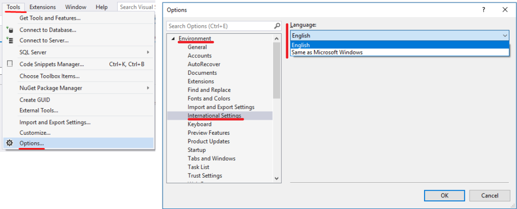 Решение: Если у Вас вдруг оказались установлены другие языковые пакеты, тогда можно просто открыть Tools -> Options -> Environment -> International Settings (Рис. 1) и выбрать нужный языковый пакет.