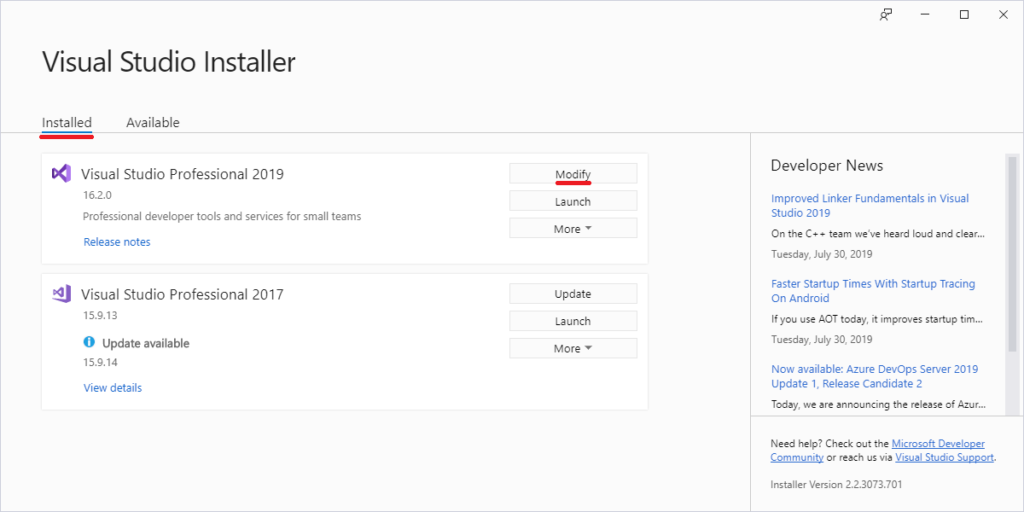 На вкладке Installed нажмите кнопку Modify напротив нужного Вам продукта (в моем случае Visual Studio 2019) (Рис. 2)