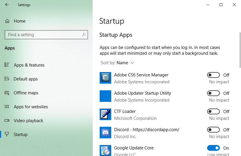 Вы также можете удалить вредоносное приложение из списка автозагрузки в настройках Windows. Щелкните значок Начинать и выберите Настройки , перейти к Приложения> Автозагрузка , найдите целевое приложение и выключите его.