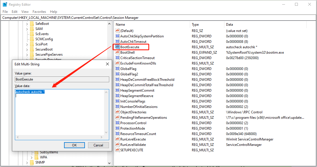 3. На правой панели щелкните правой кнопкой мыши на BootExecute и выберите Изменить .
