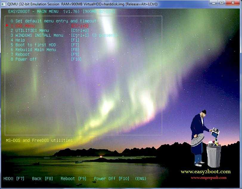После того как образы запишутся на USB накопитель, необходимо сделать последнюю операцию, нажав комбинацию клавиш Ctrl + F2. Через пару минут ваш мультизагрузочный накопитель будет готов. Проверить его работоспособность можно во встроенном эмуляторе RMPrepUSB. Чтобы его запустить, нажмите клавишу F11. После нажатия кнопки начнётся загрузка эмулятора с вашим накопителем и через несколько минут вы увидите меню загрузчика.