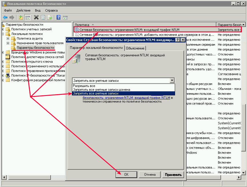 «). Перейдите в «Локальные политики» —> «Параметры безопасности» —> «Сетевая безопасность: Ограничения NTLM: входящий трафик NTLM» и установите значение «Запретить все учетные записи»: